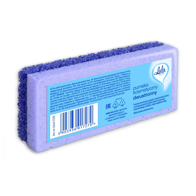 Pumeks dwustronny, posiada 2 powierzchnie ścierne o różnej porowatości: jedna strona służy do usuwania zrogowaciałego naskórka, druga wygładza skórę. - Skład: Pianka poliuretanowa. - W kolorach: pomarańczowym, fioletowym, zielonym, niebieskim