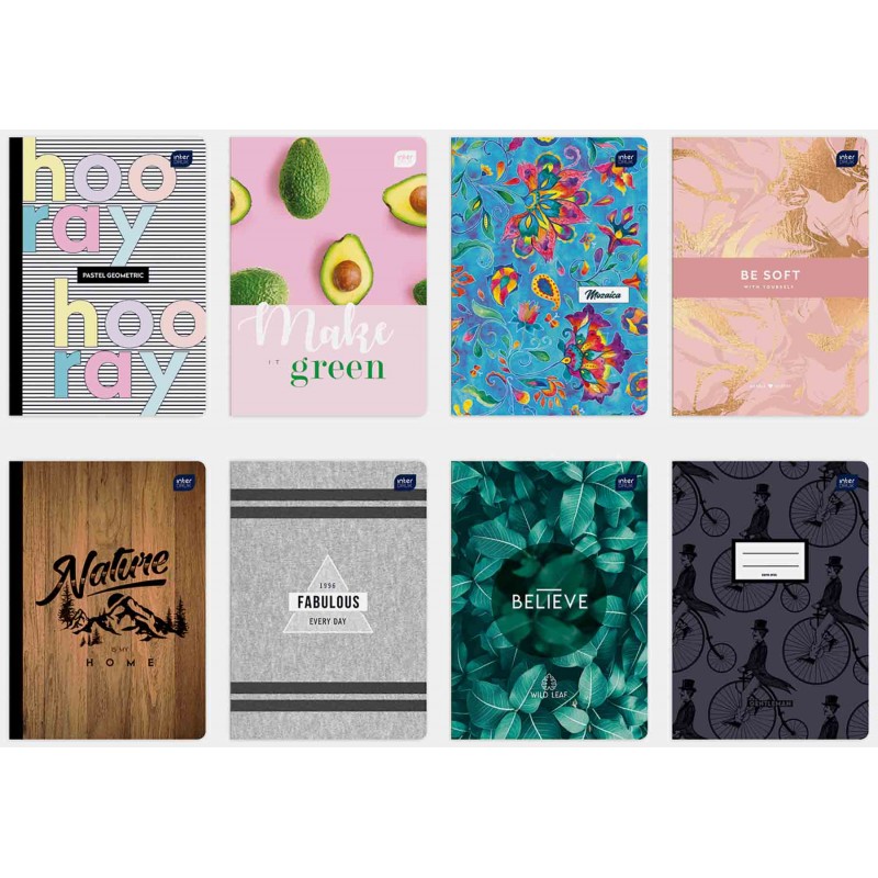 Okładka pokryta lakierem UV. Zaokrąglone rogi. Duża różnorodność wzorów, dopasowana do grup docelowych. Zeszyty w intensywnych kolorystycznie grafikach, zaprojektowane zgodnie z aktualnymi trendami w designie i modzie tak, aby sprostać wysokim oczekiwaniom każdego ucznia. Wysokiej jakości okładka zabezpieczona błyszczącym lakierem ochroni wszystkie ważne notatki.