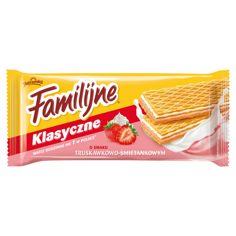 Wafle przekładane kremem o smaku truskawkowo-śmietankowym 72,5 %.