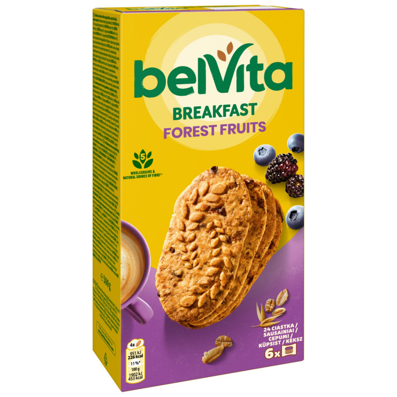 Chrupiące ciastka BelVita z owocami leśnymi są wypiekane z 5 pełnoziarnistych zbóż. To pyszny element zbilansowanego śniadania. Ciesz się czterema ciastkami BelVita z jogurtem, porcją owoców i gorącym napojem, kawą lub herbatą. Produkty belVita powstają ze starannie wyselekcjonowanych składników, wypiekanych w postaci pysznych i pożywnych chrupiących ciasteczek oraz miękkich wypieków . Zawierają 5 pełnych ziaren, są źródłem błonnika i magnezu.