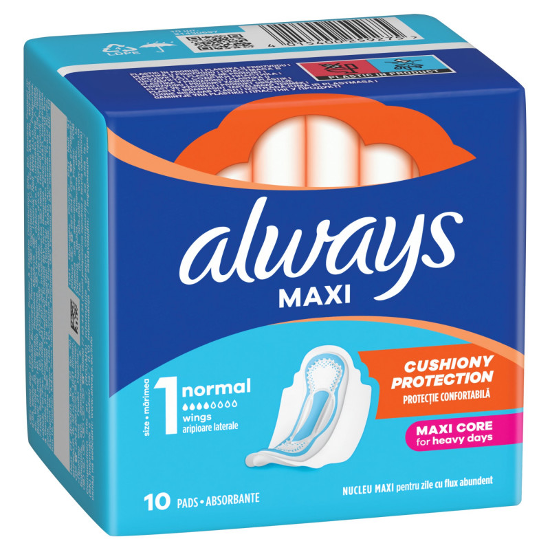 Zapewnij sobie ochronę dzięki Podpaskom ze skrzydełkami Always Maxi Normal (Rozmiar 1). Zaprojektowane specjalnie z myślą o obfitym krwawieniu podpaski z ultrachłonnym wkładem zapewniają doskonałą, zaawansowaną ochronę przed przeciekaniem. Miękka powłoczka zwiększa komfort noszenia, a grubsza konstrukcja podpaski zapewnia poczucie pewności siebie i niezawodną ochronę przed przeciekaniem. Dla dodatkowej ochrony w nocy wypróbuj podpaski Always Maxi w rozmiarze 4.