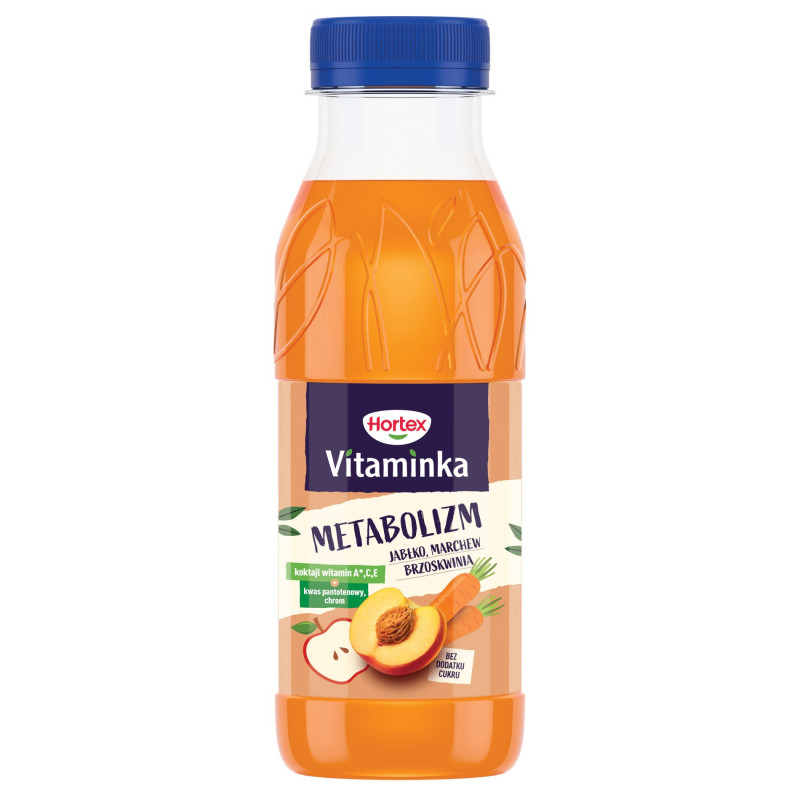 Hortex Vitaminka gęsty i pożywny sok z jabłek, marchwi i brzoskwiń to pyszny sposób na codzienną porcję owoców i warzyw. Vitaminka jest bogata w: witaminę A- pomaga w utrzymaniu prawidłowego widzenia oraz zachowaniu zdrowej skóry, witaminę C- przyczynia się do zmniejszenia uczucia zmęczenia i znużenia, witaminy C i E- pomagają w ochronie komórek przed stresem oksydacyjnym. Pasteryzowany. Bez dodatku cukrów. Zawiera naturalnie występujące cukry.