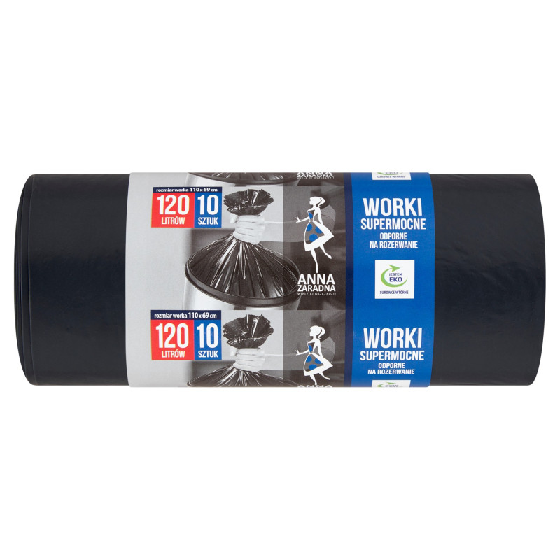Worki wykonane z przetworzonych odpadów foliowych bez użycia surowców pierwotnych. Tylko surowce wtórne plus dodatki barwiące i zapachowe. 110 x 69 cm +/-5 %. Supermocnych worków na śmieci marki Anna Zaradna użyj do pakowania odpadów sanitarnych i śmieci. Worki są wykonane z grubej folii, dzięki czemu są bardziej wytrzymałe na obciążenia.
